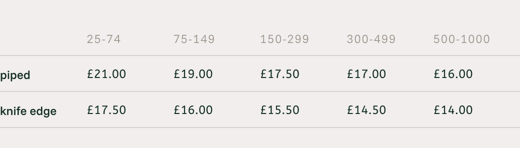 This pricing guide is designed to give you clear, upfront visibility of our manufacturing costs across a range of order quantities, starting from as low as 25 units and scaling to over 1,000. To help you plan effectively, we provide pricing for both options: producing your designs using your own supplied fabric, or using our factory-sourced materials.