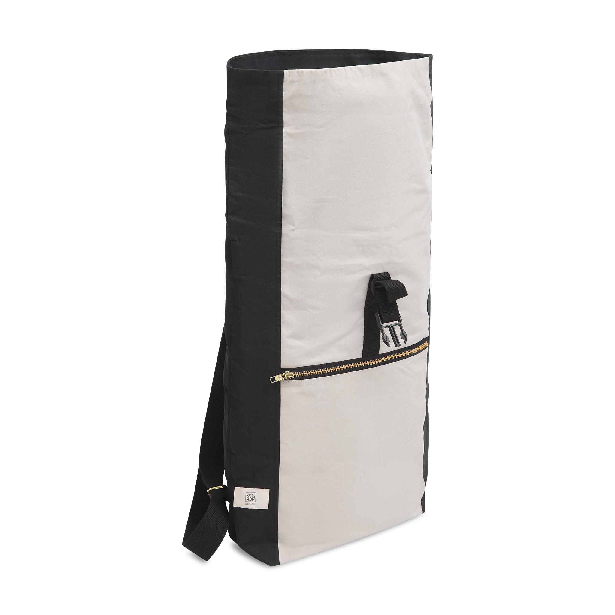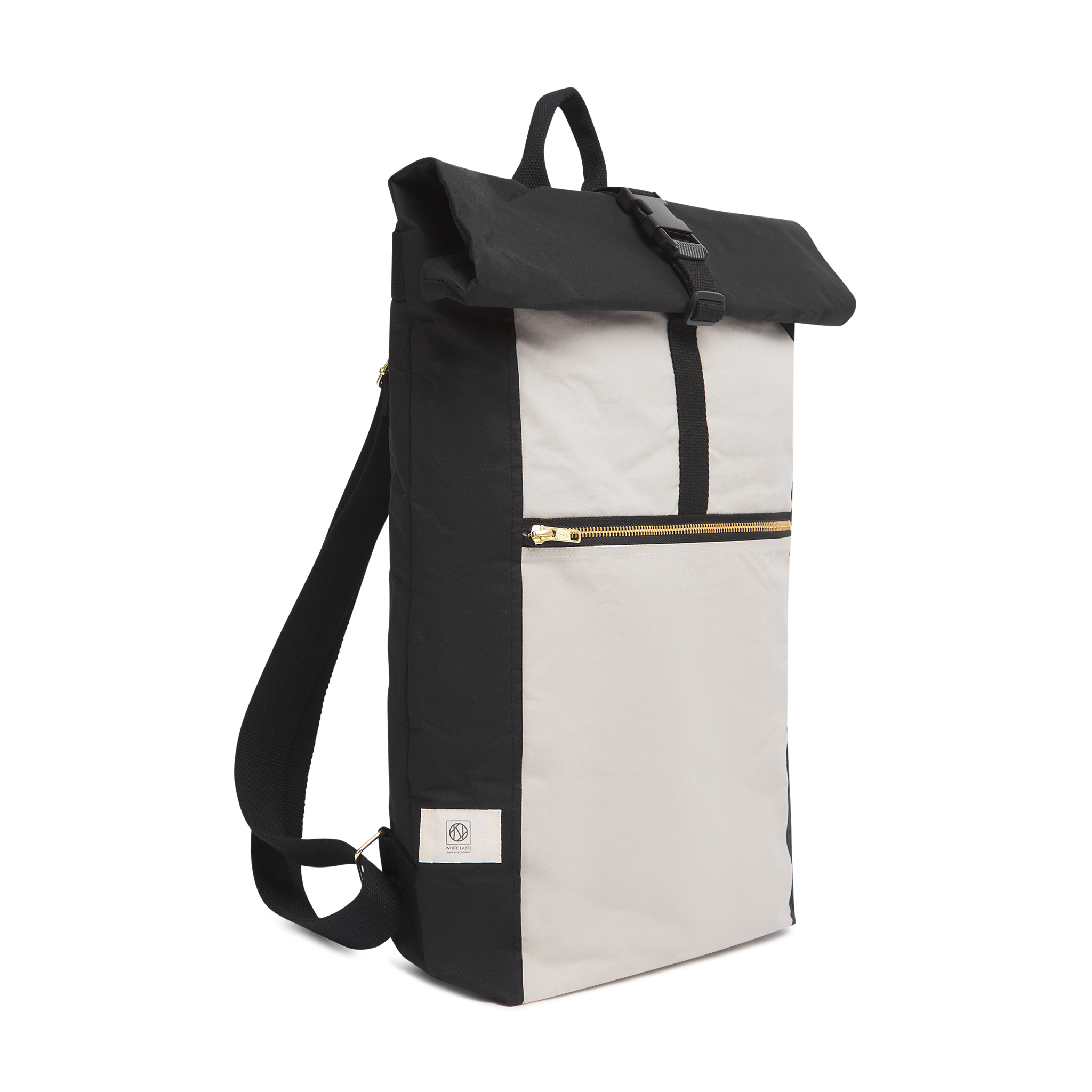 Sleek, large roll-top backpack made in-house with client fabric. Scandinavian-inspired minimal rucksack silhouette emphasises the material(s).