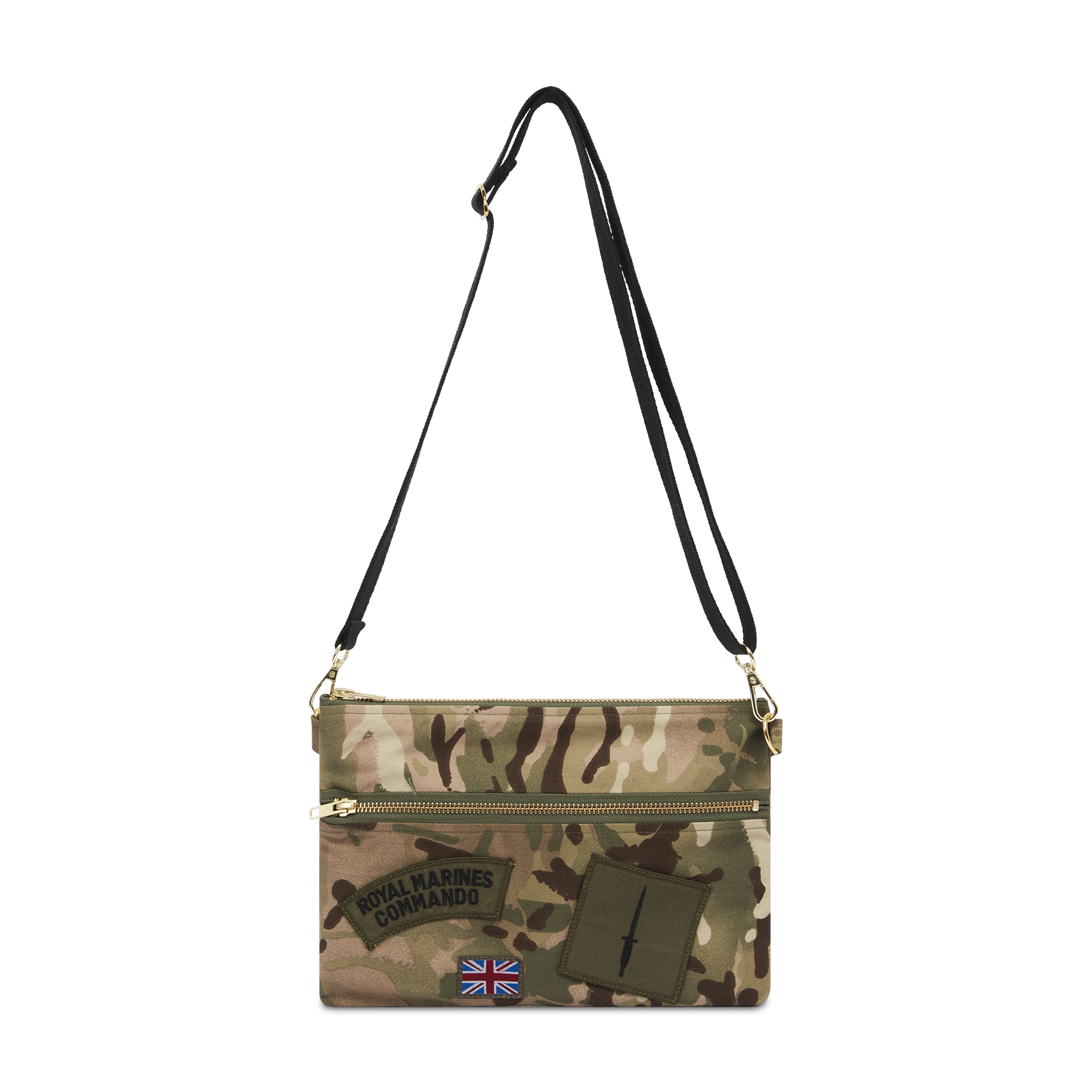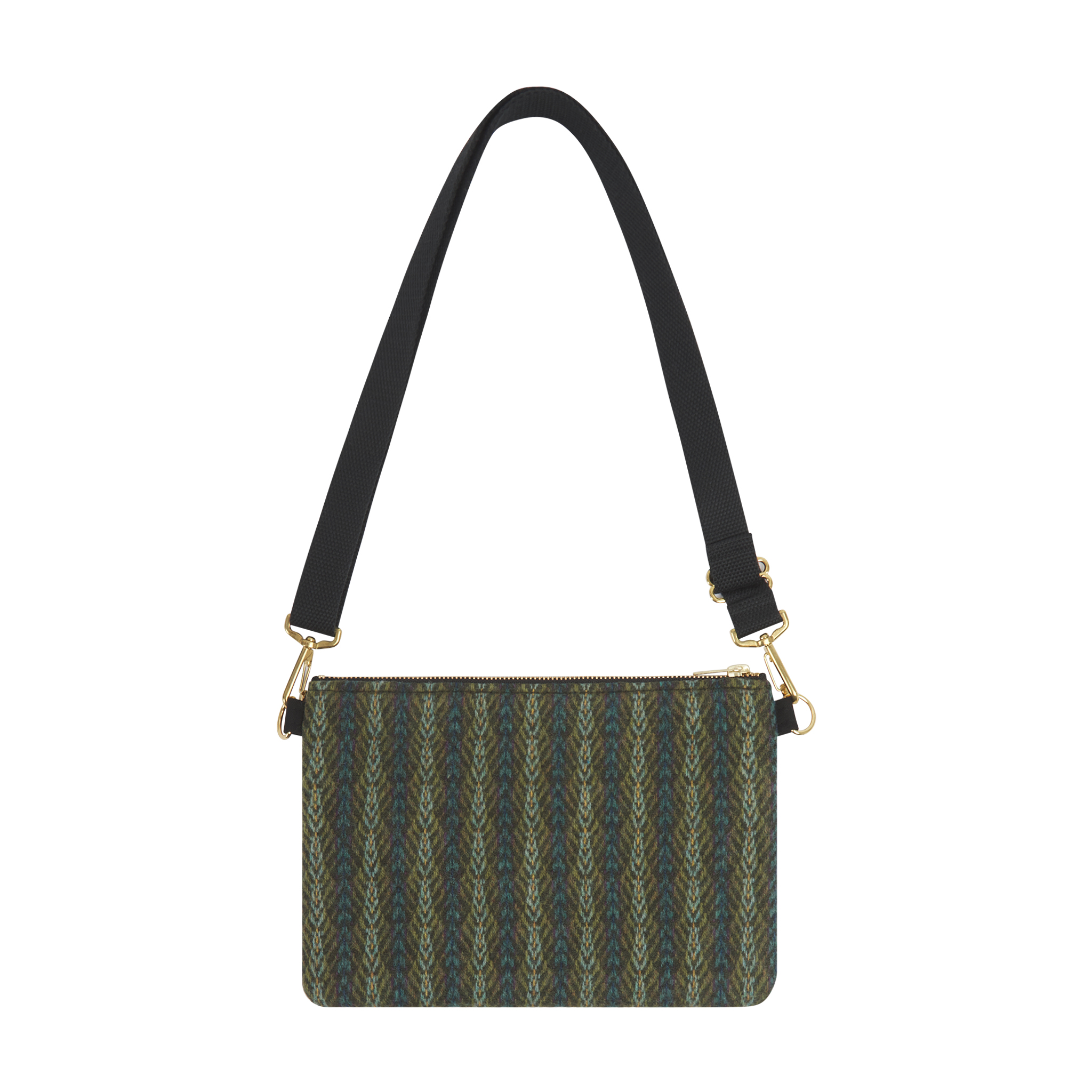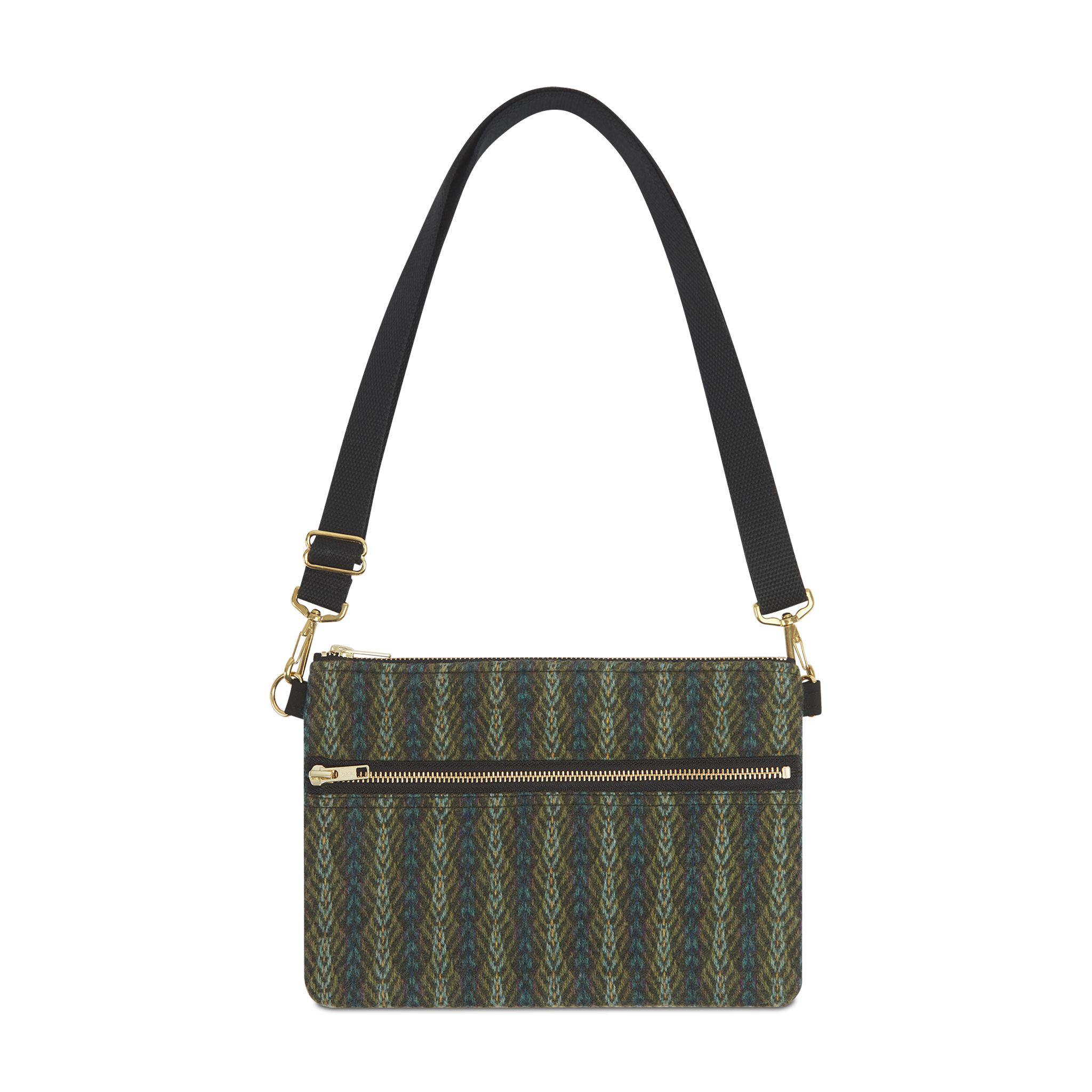 Compact cross-body bag made with client fabric. Clean, functional design puts the material at the forefront. Two sets of compartments.